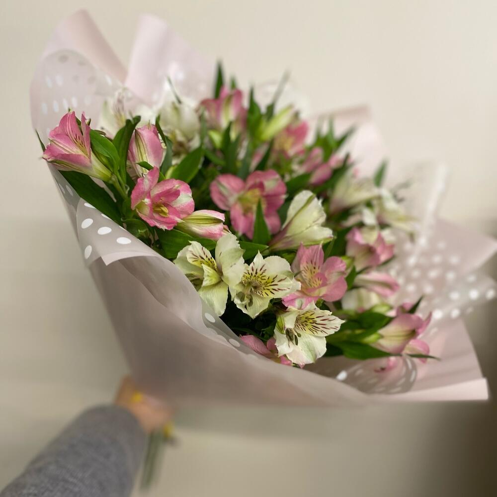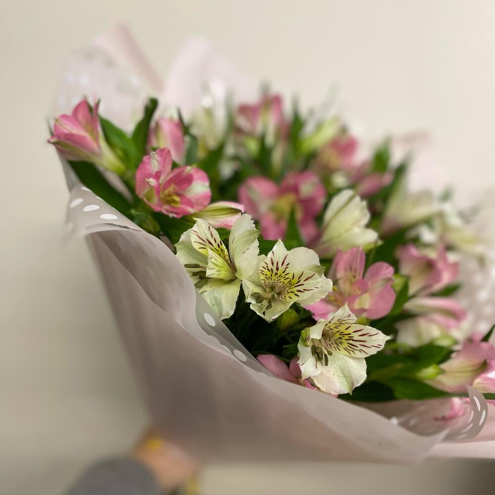 Упаковка – 5 шт.Лента атласная – 3 шт.альстромерия микс – 7 шт.зелень фисташки – 5 шт.