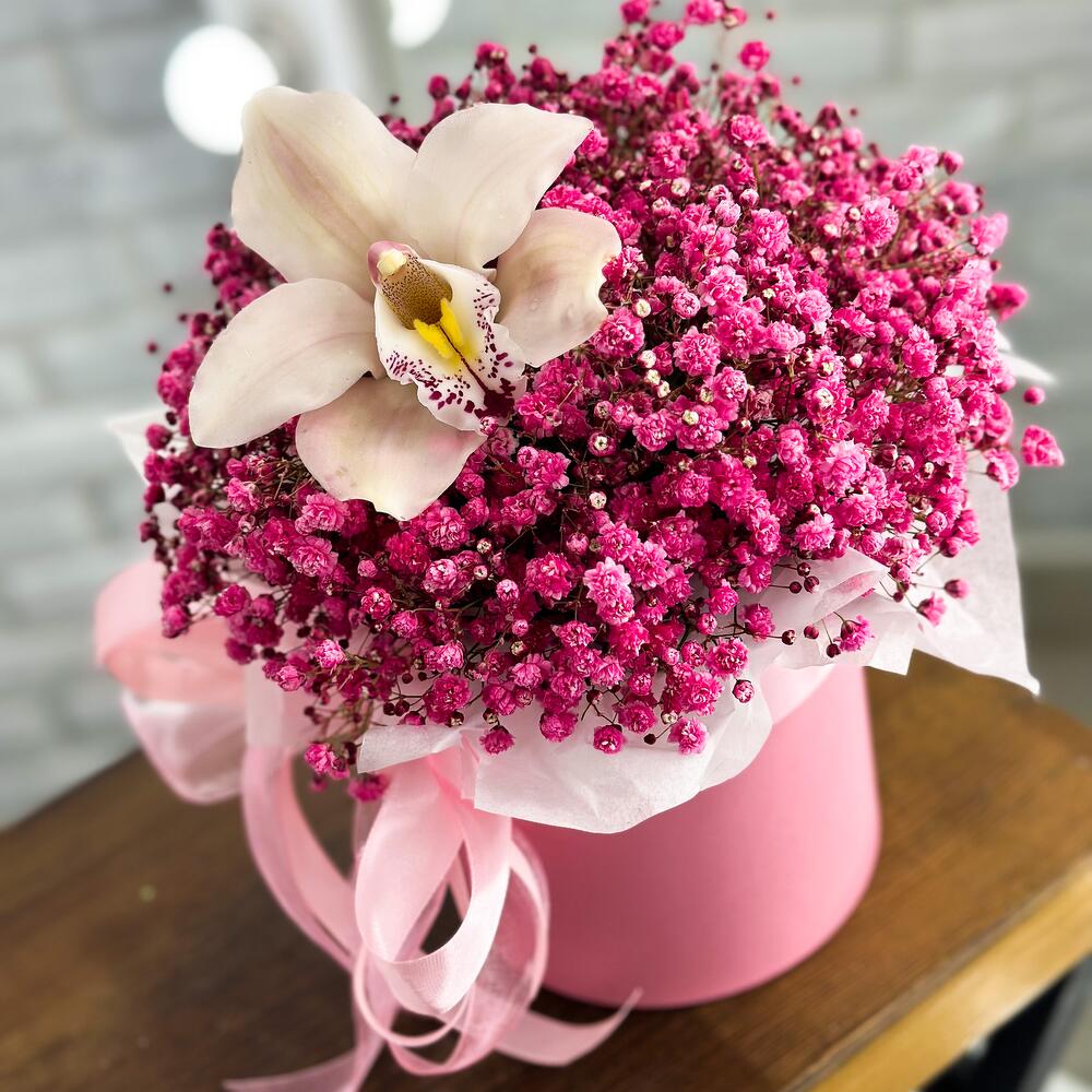 Гипсофила – 7 шт.Тишью – 1 шт.Орхидея цимбидиум мини – 1 шт.Открыточка с вашими пожеланиями – 1 шт.шляпная коробка с лентами и оазисом – 1 шт.