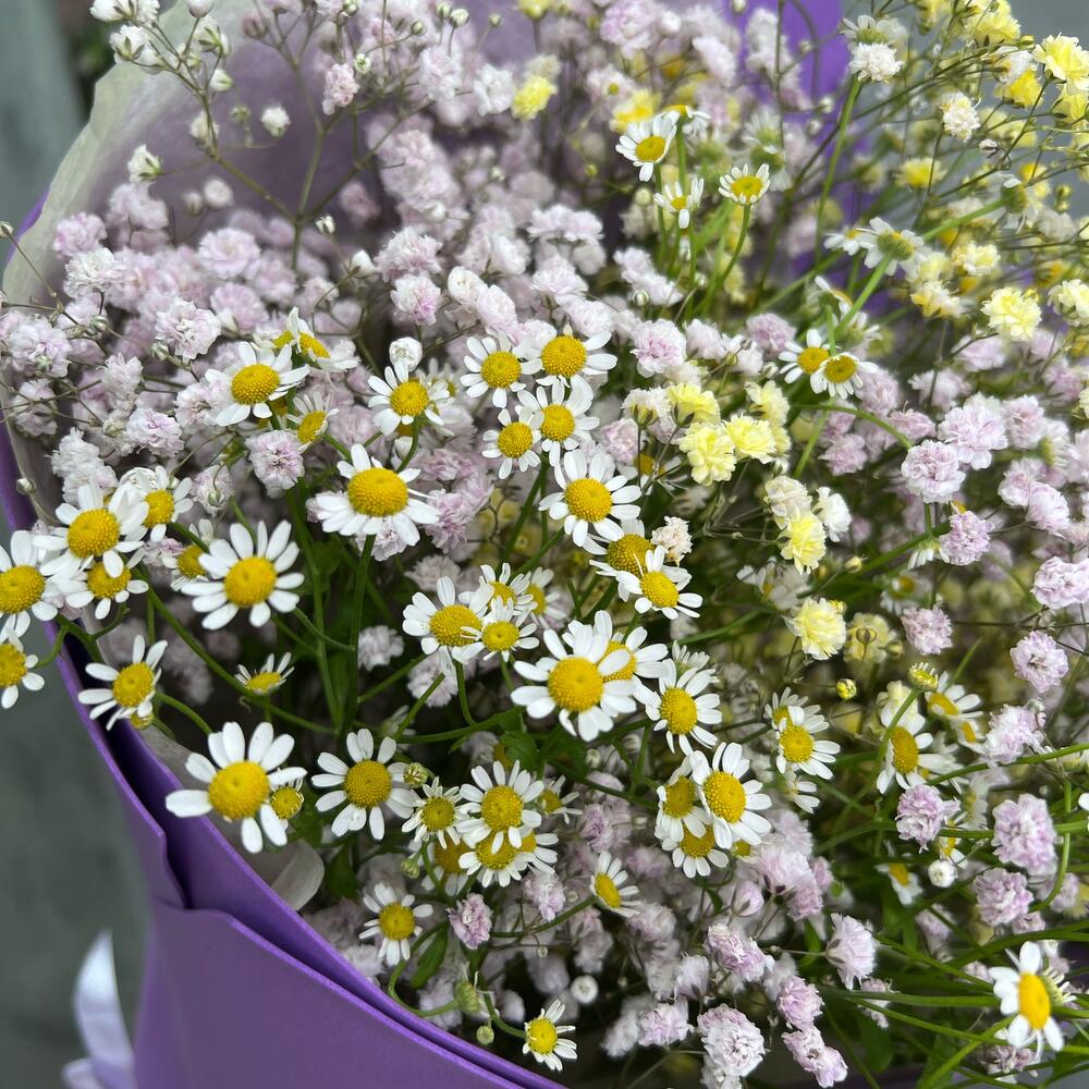 Лента атласная – 1 шт.Матрикария – 4 шт.Упаковка дизайнерская – 2 шт.гипсофила радужная – 3 шт.