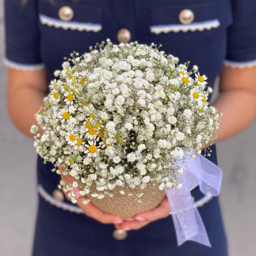 Гипсофила – 11 шт.Матрикария (Ромашка Камила) – 3 шт.кашпо джутовое ручной работы – 1 шт.Лента органза – 1 шт.