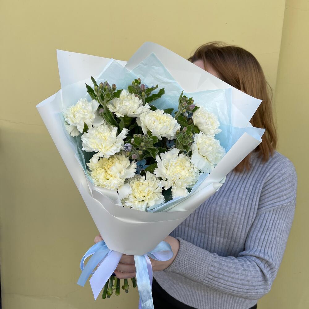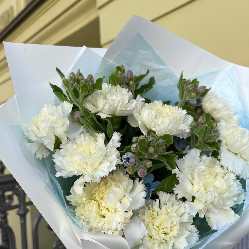 Лента атласная – 2 шт.Упаковка корейская пленка – 1 шт.тишью голубое – 1 шт.твидия голубая – 5 шт.диантус белоснежный – 9 шт.