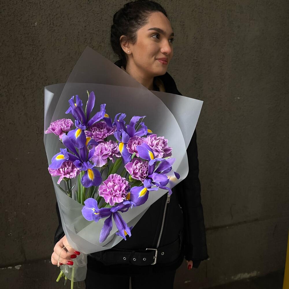 Гвоздика сортовая – 8 шт.Упаковка дизайнерская – 2 шт.Ирис Blue Magic – 5 шт.