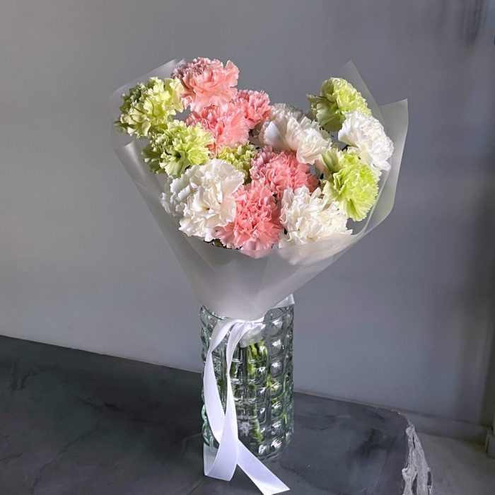 Лента – 1 шт.Диантус белый – 5 шт.Диантус розовый – 5 шт.Диантус салатовый – 5 шт.Дизайнерская упаковка – 1 шт.