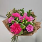 роза кения – 5 шт.Альстромерия – 5 шт.диантусы – 3 шт.зелень фисташки – 1 шт.Дизайнерская упаковка – 1 шт.