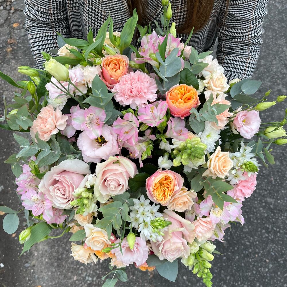 Альстромерии, Гвоздики, Кустовые розы, Лизиантусы, Розы, Хризантемы