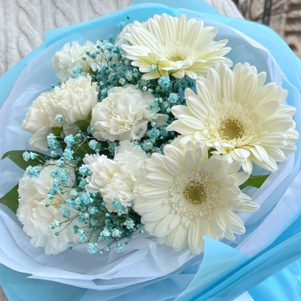 Голубой воздушный букет с герберами и диантусом