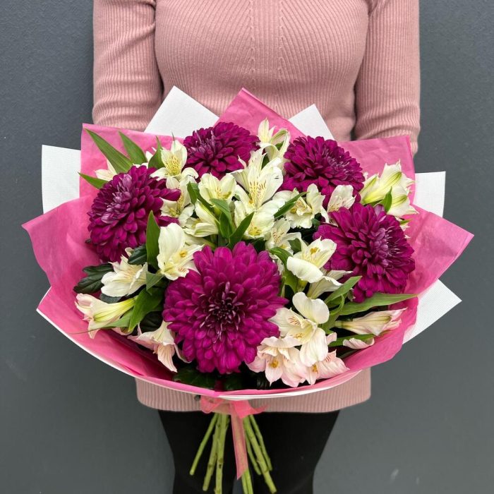 Альстромерия – 6 шт.Лента атласная – 2 шт.Тишью – 2 шт.Пленка матовая – 2 шт.ламира хризантема – 5 шт.