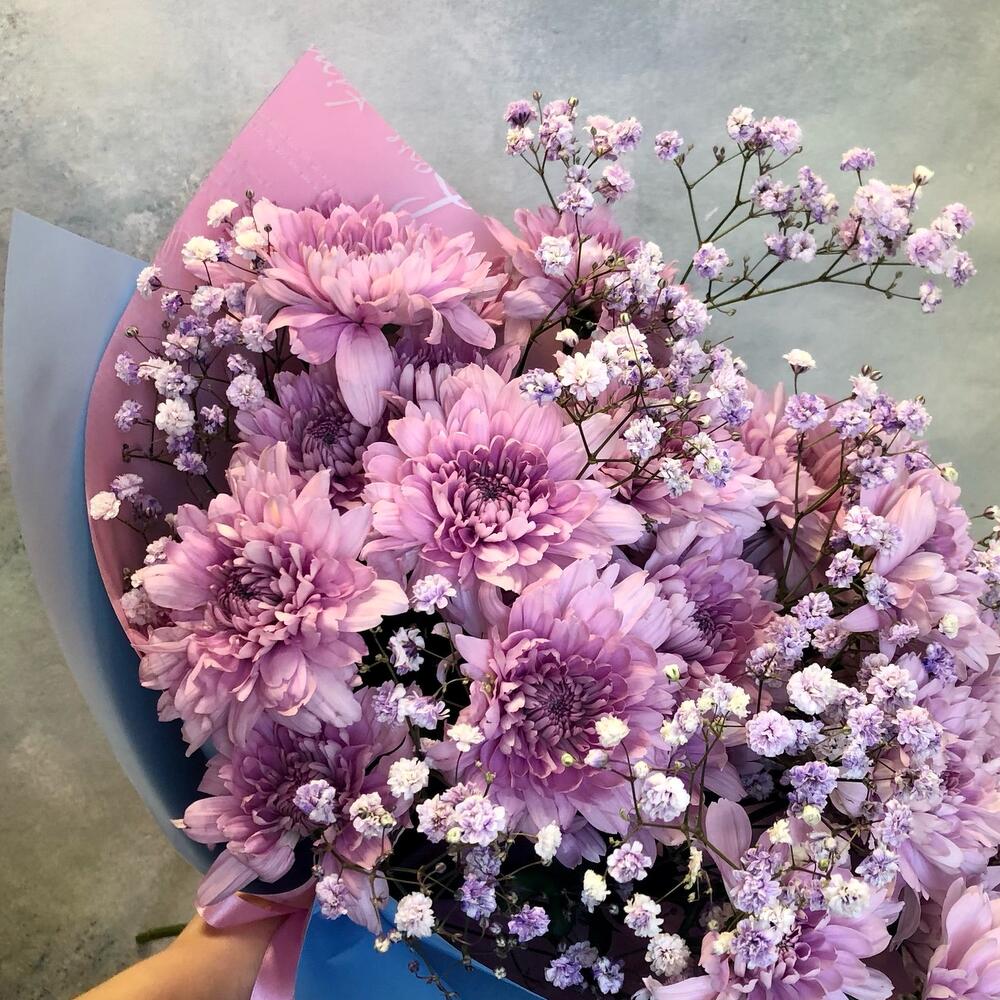 Хризантема кустовая – 5 шт.гипсофила радужная – 2 шт.Рускус – 2 шт.Упаковка дизайнерская – 2 шт.