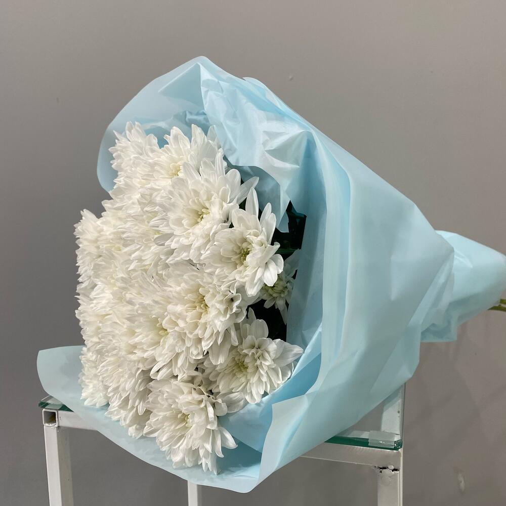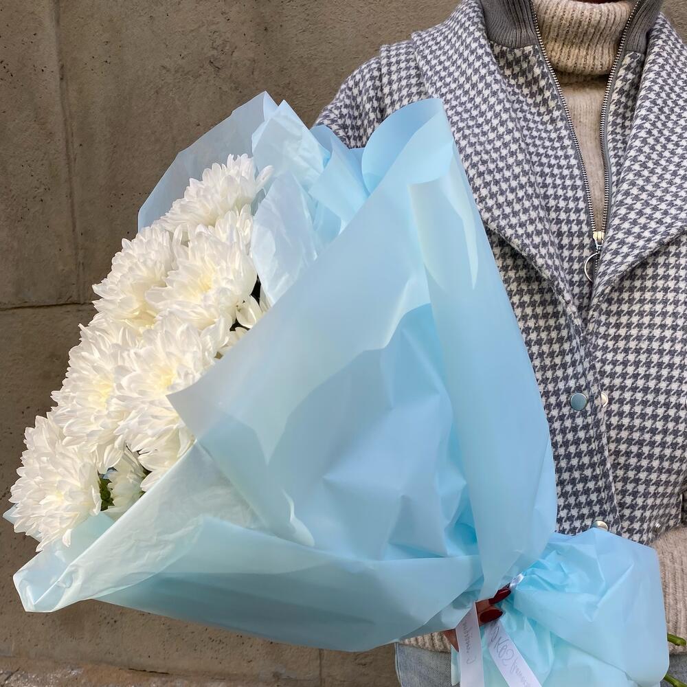 Хризантема кустовая белая – 5 шт.Тишью – 3 шт.Упаковка дизайнерская – 4 шт.лента атласная брендированная – 1 шт.