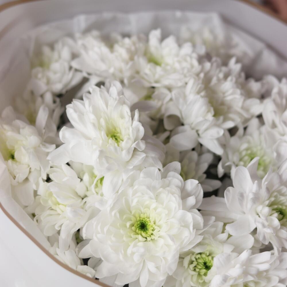 Хризантема кустовая – 7 шт.Открыточка с вашими пожеланиями – 1 шт.Шоколадка – 1 шт.Дизайнерская упаковка – 1 шт.