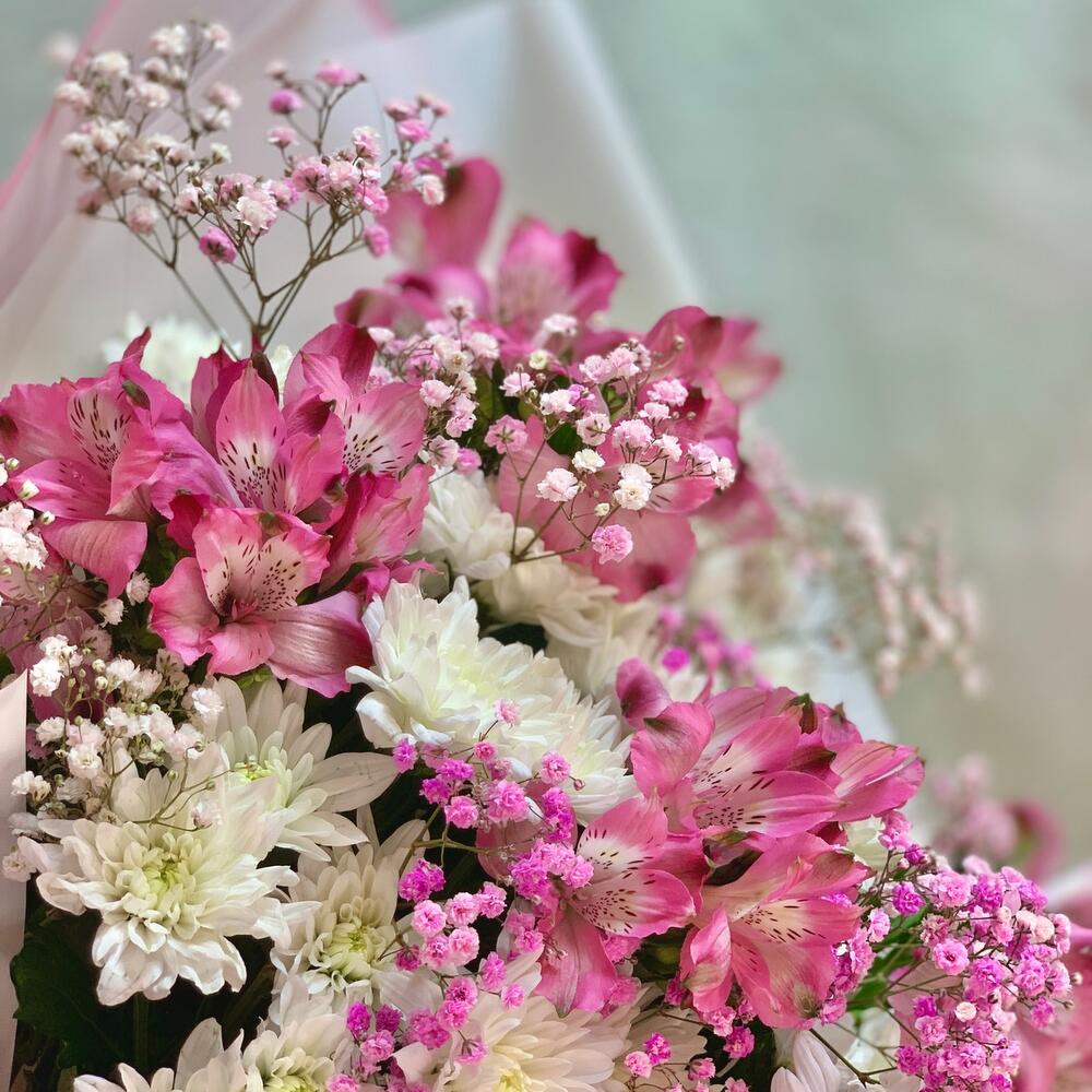 Хризантема кустовая – 10 шт.Альстромерия – 5 шт.Гипсофила – 5 шт.Упаковка дизайнерская – 3 шт.