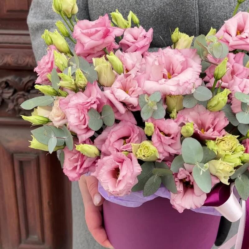 Эвкалипт – 3 шт.Лента атласная – 2 шт.Тишью – 1 шт.Коробка шляпная – 1 шт.Оазис флористический – 1 шт.эустома махровая розовая – 7 шт.