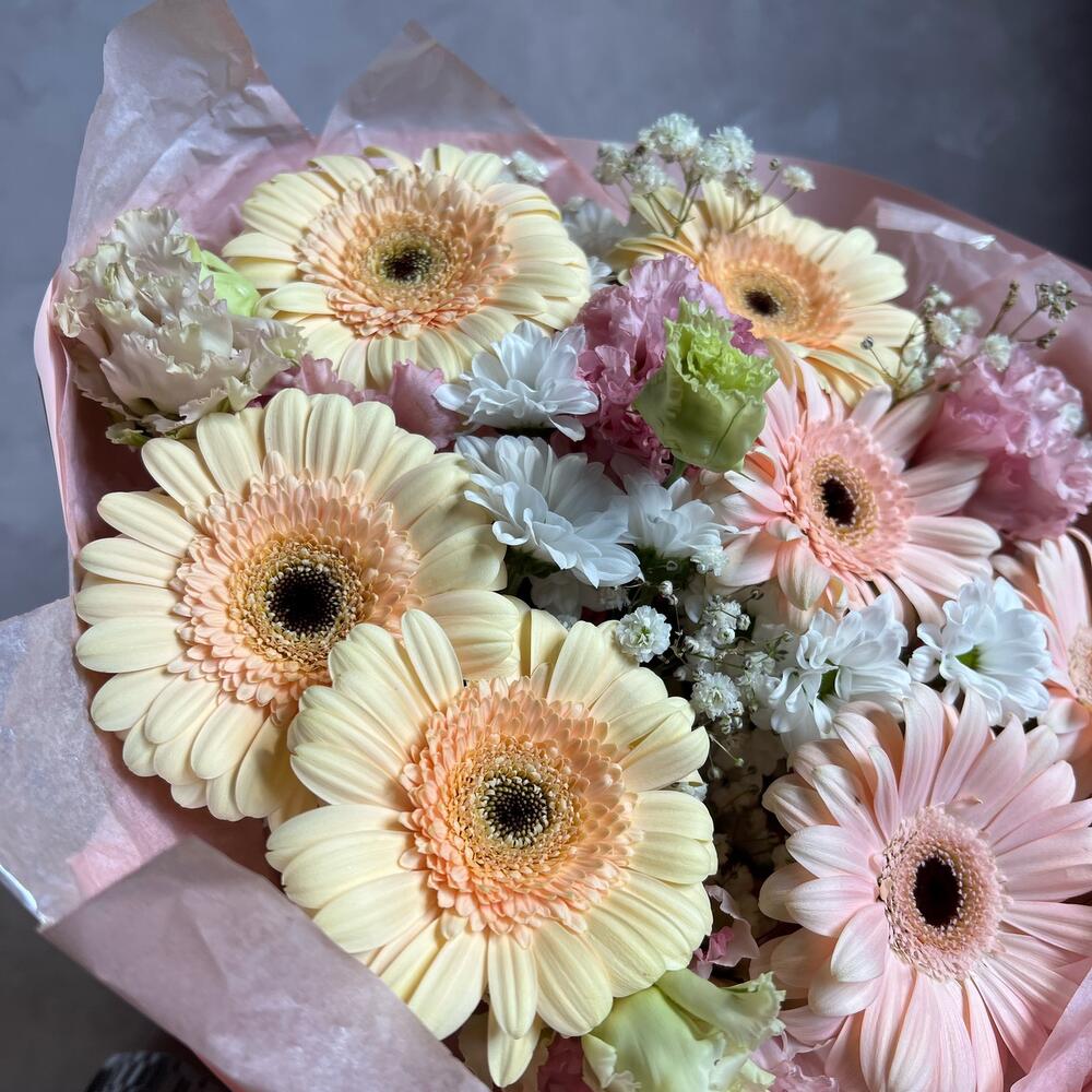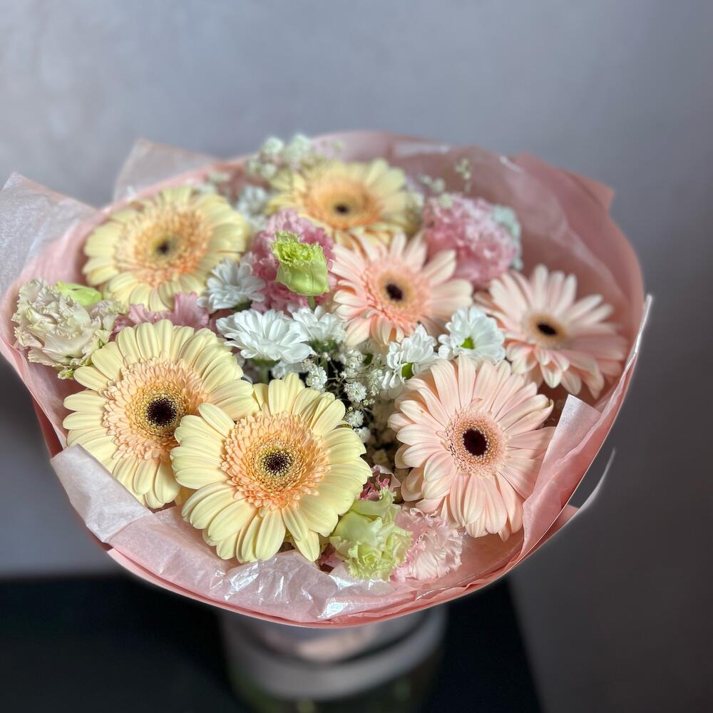 Гербера – 7 шт.Гипсофила – 2 шт.Сантини – 2 шт.Лизиантус – 1 шт.декоративная упаковка – 1 шт.Атласная лента – 1 шт.