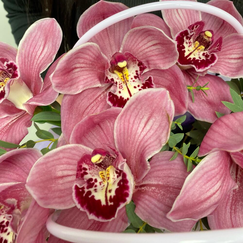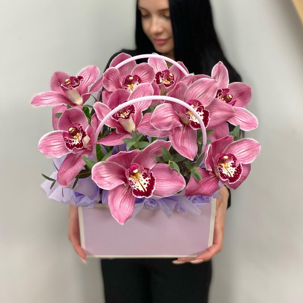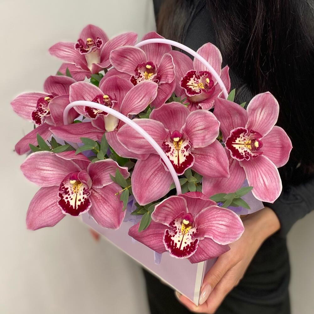 Орхидея Цимбидиум – 9 шт.Эвкалипт – 2 шт.Сумка картон – 1 шт.Оазис флористический – 1 шт.Тишью – 1 шт.