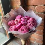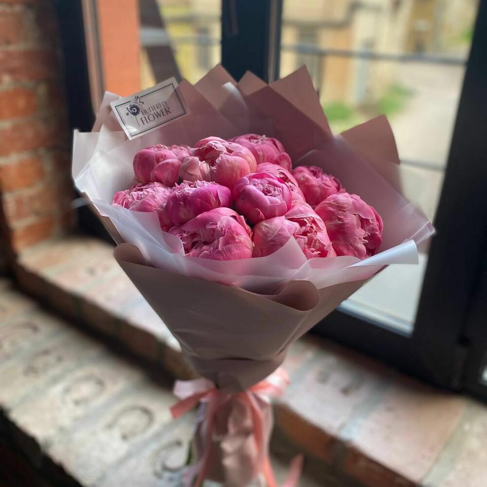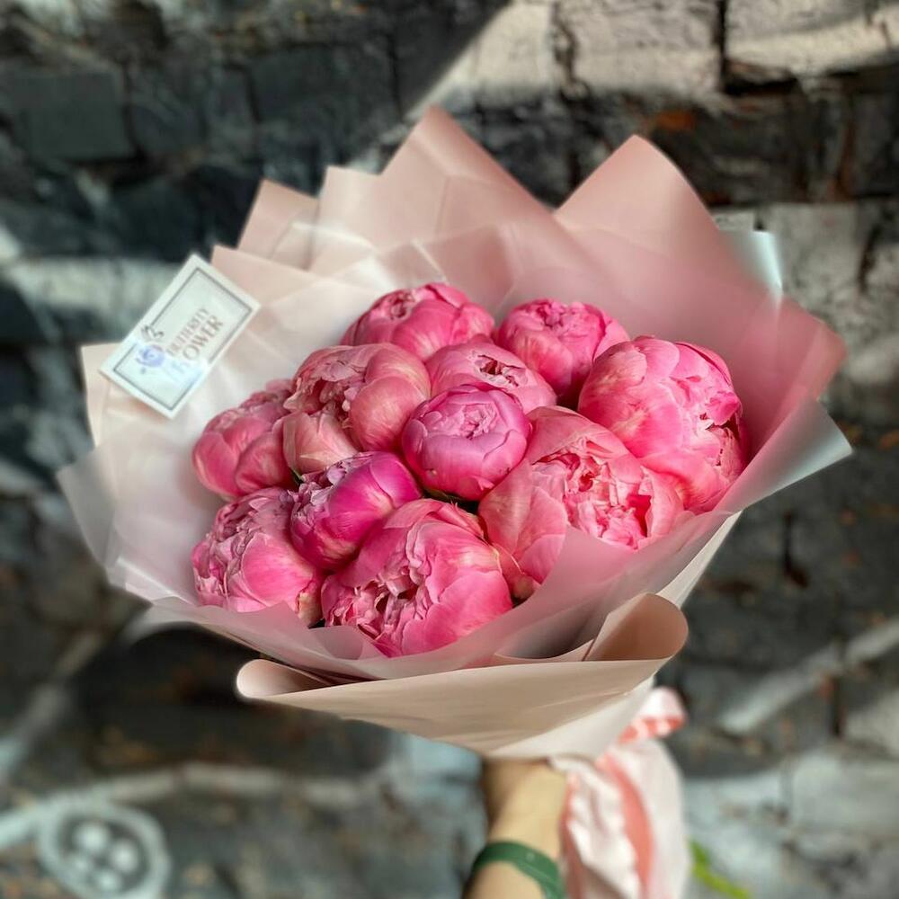 Букет из 11 ярко-розовых пионов в дизайнерской упаковке “Феликс Суприм”