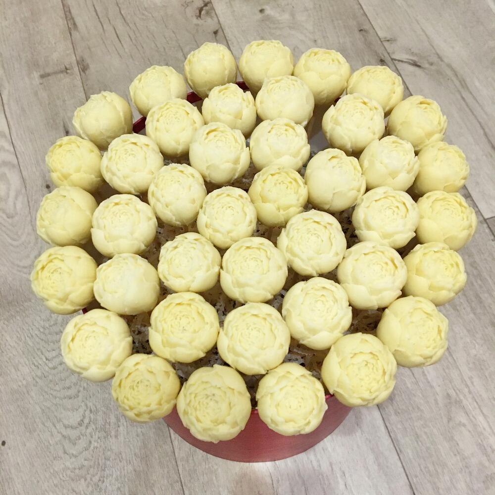 пионы из бельгийского белого шоколада – 41 шт.Шпажки – 41 шт.Упаковка – 1 шт.Атласная лента – 1 шт.Шляпная коробка – 1 шт.