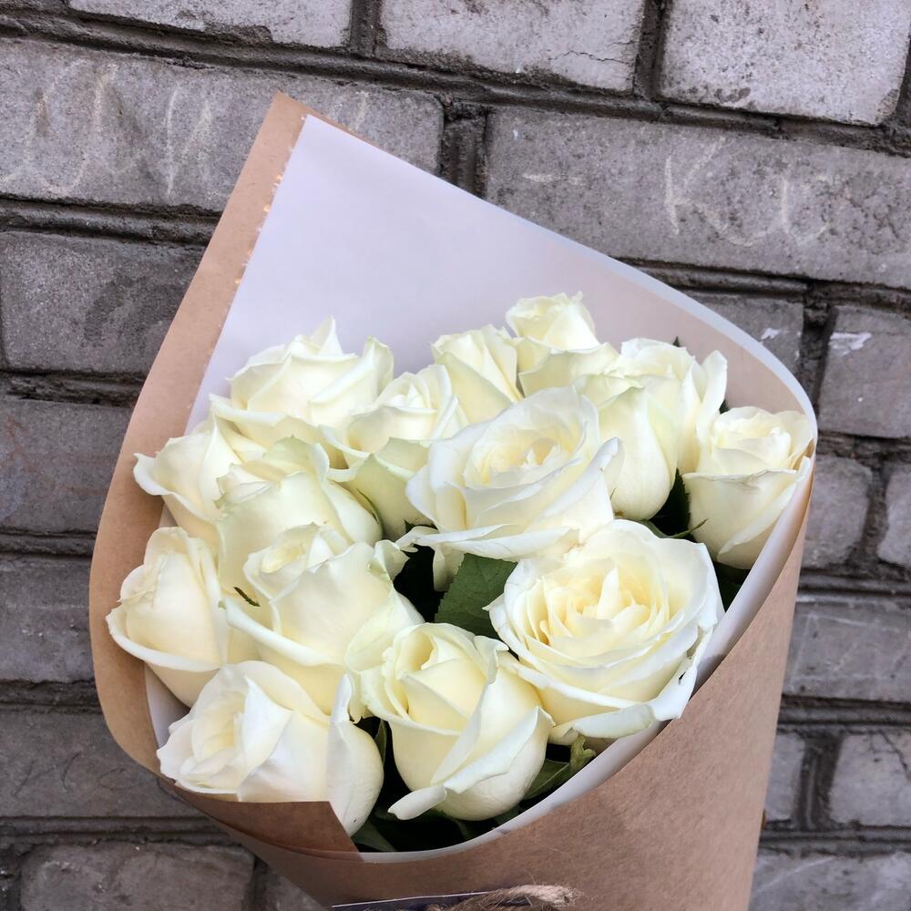 розы белые 15 штук 60 см – 15 шт.Крафт дизайнерский – 1 шт.Пленка матовая – 1 шт.Лента атласная – 1 шт.