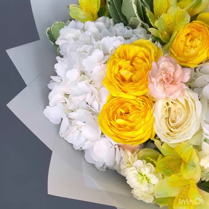 Авторский букет из белой Гортензии и желтых пионовидных Роз