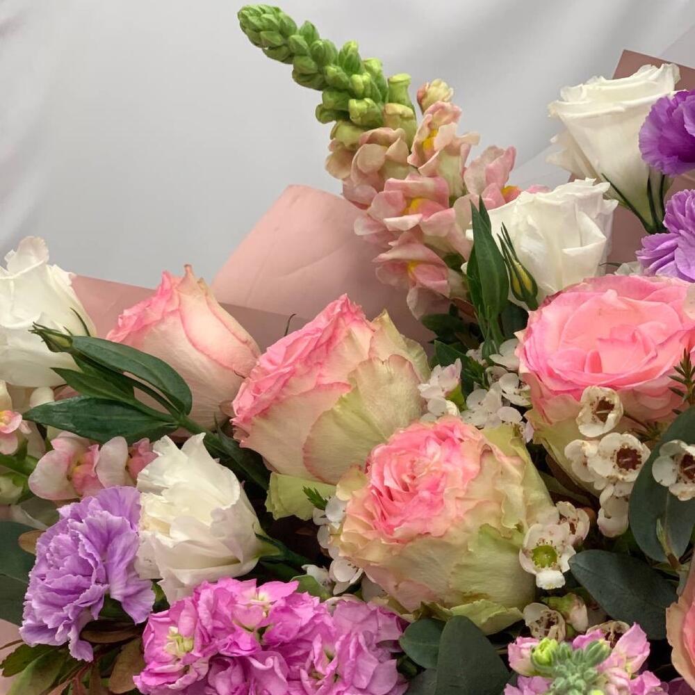 Роза Эквадор – 5 шт.антиринум – 3 шт.Маттиола – 3 шт.Лизиантус – 3 шт.Диантус – 4 шт.Ваксфлауэр – 2 шт.Эвкалипт – 6 шт.Фисташка – 6 шт.