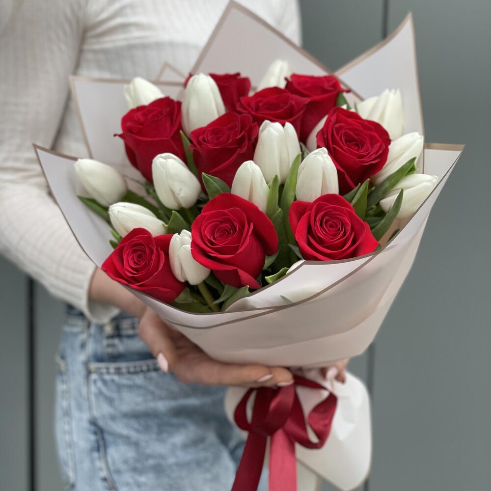 Оформление – 1 шт. Тюльпан белый (голландия) – 16 шт. красная роза сорта фридом – 9 шт.