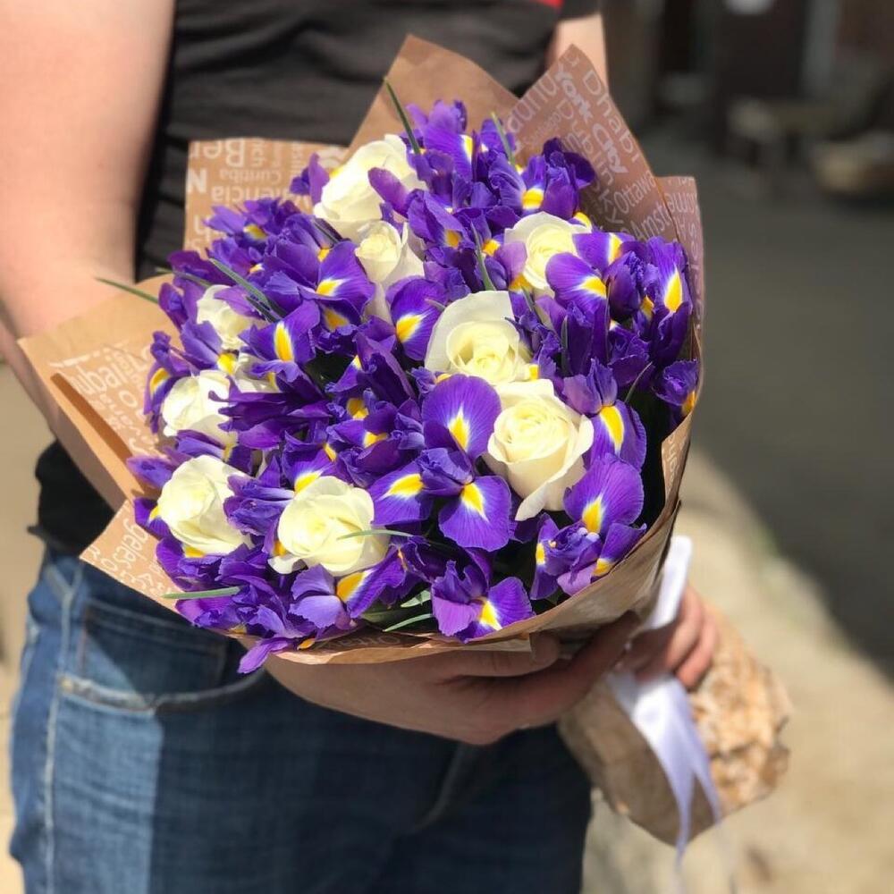 ирисы синие – 30 шт.роза белая mondial – 9 шт.Упаковка крафт – 1 шт.Атласная лента – 1 шт.