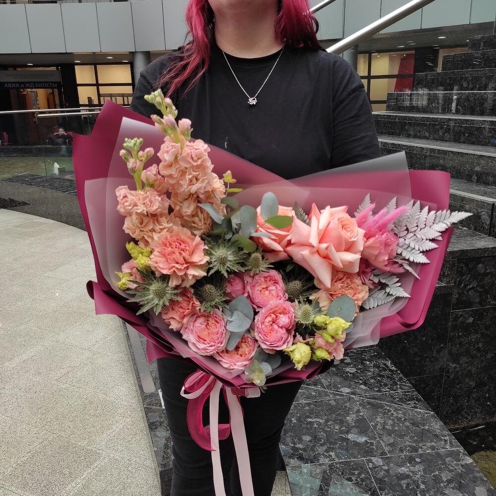 кахала роза – 2 шт.маттиола персиковая – 2 шт.джульетта роза пионовидная – 1 шт.Диантус – 3 шт.Эрингиум – 1 шт.Папоротник – 1 шт.Лагурус (сухоцвет) – 3 шт.Упаковка дизайнерская – 1 шт.
