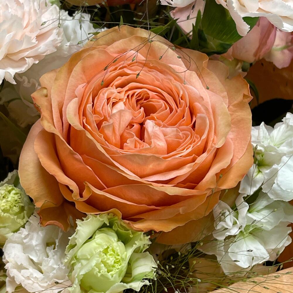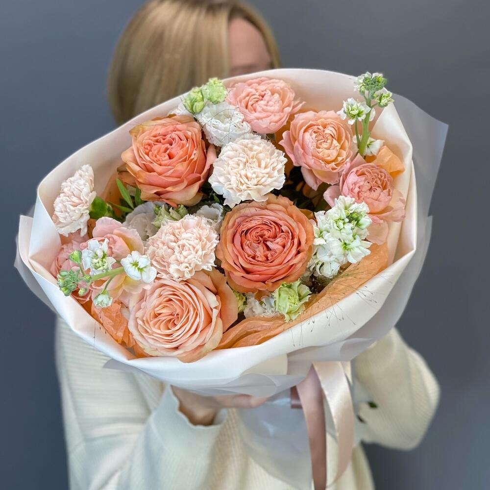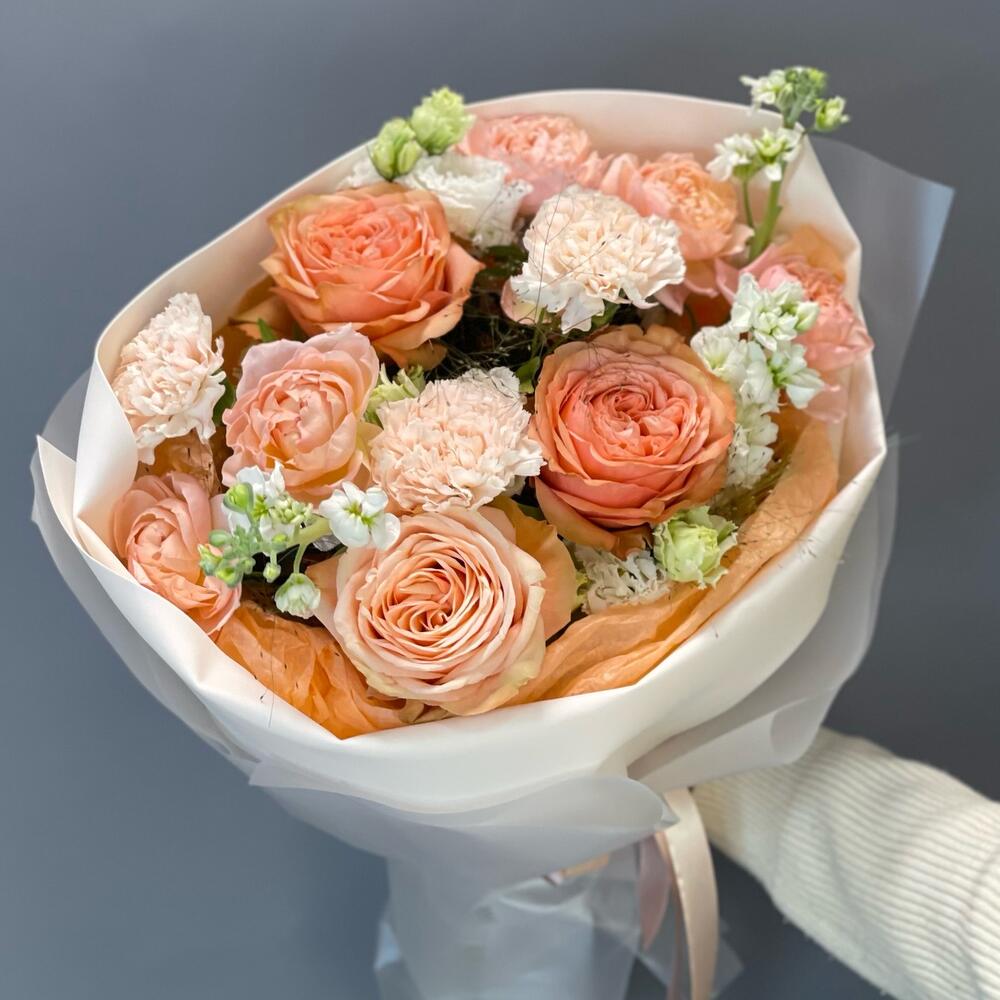 Роза одноголовая – 3 шт.Роза кустовая джульетта – 2 шт.Фисташка – 3 шт.Маттиола – 2 шт.Лизиантус – 2 шт.Упаковка дизайнерская – 2 шт.Лента – 1 шт.Гвоздика одноголовая – 3 шт.Тишью – 2 шт.Паникум – 2 шт.