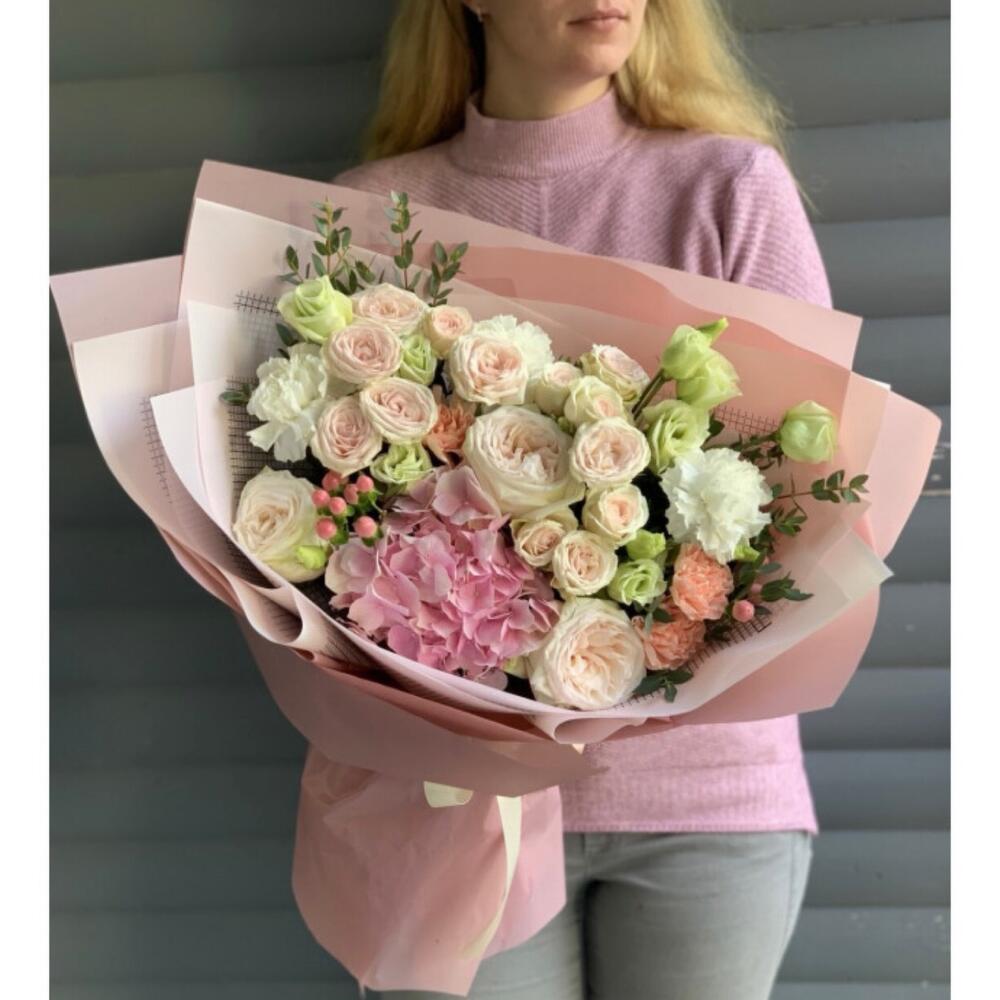 Альстромерии, Гвоздики, Кустовые розы, Лизиантусы, Розы, Хризантемы