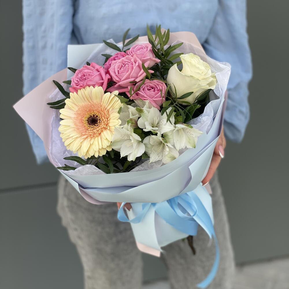 Альстромерия – 1 шт. Писташ – 2 шт. Оформление – 1 шт. герберы – 1 шт. кустовая роза артезия – 1 шт.