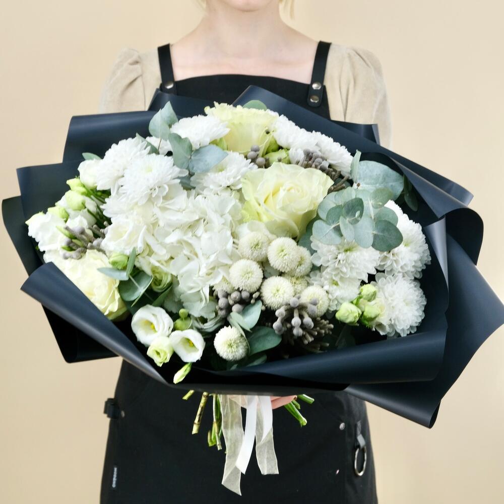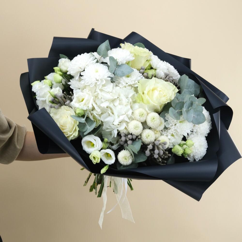 Гортензия – 1 шт.Роза – 1 шт.Бруния – 1 шт.Хризантема кустовая – 4 шт.Лизиантус – 2 шт.Эвкалипт – 1 шт.Упаковка – 1 шт.акваножка – 1 шт.