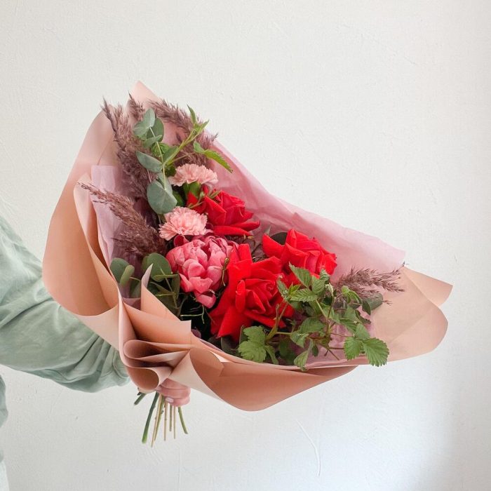 Пион Коралл Шарм (Coral Charm) – 1 шт.Эвкалипт – 3 шт.Лента атласная – 1 шт.Тишью – 1 шт.Диантус – 2 шт.Роза французская – 3 шт.Ветки малины – 2 шт.Тростник – 5 шт.Аквапак – 1 шт.Корейская пленка – 3 шт.черничик – 4 шт.