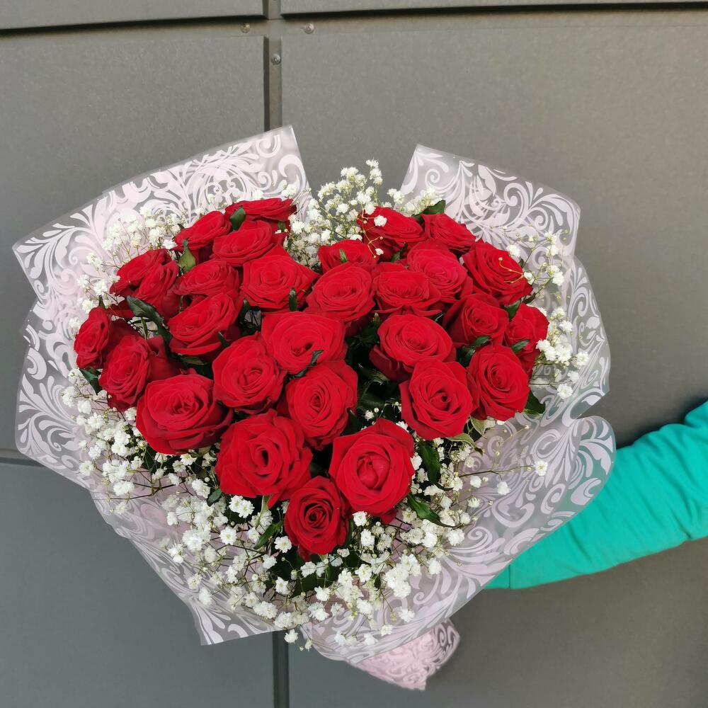 Красивый высокий букет из 31 красной крупной розы, собрано флористом в форме красивого сердца.