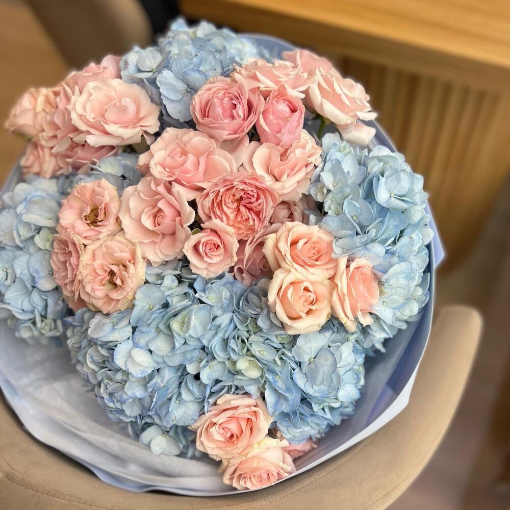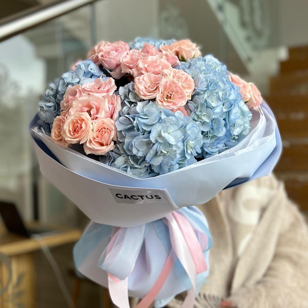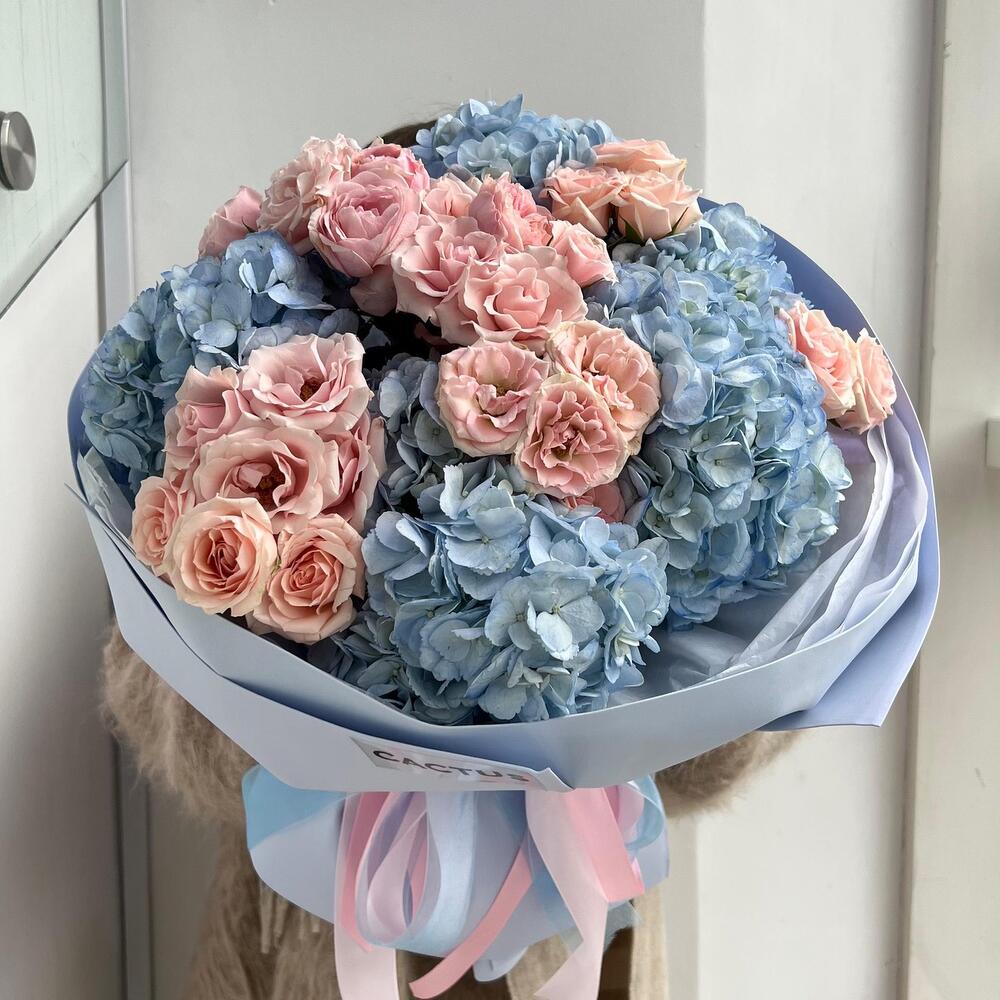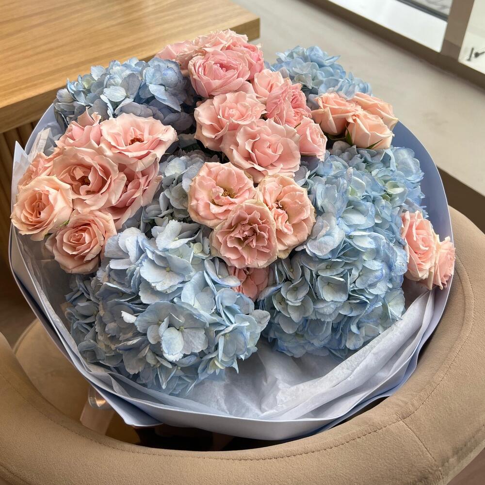 Альстромерии, Гортензии, Кустовые розы, Лизиантусы, Розы, Хризантемы