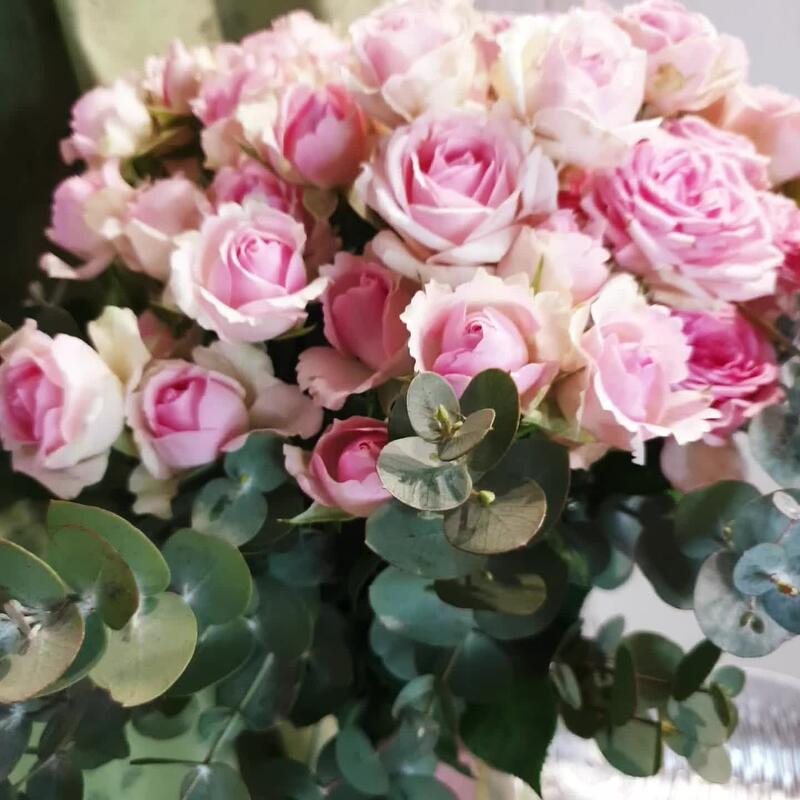 Эвкалипт – 5 шт.Лента атласная – 1 шт.Роза кустовая пионовидная – 7 шт.Пакет подарочный – 1 шт.Кризал (подкормка) – 2 шт.Ваза стеклянная – 1 шт.
