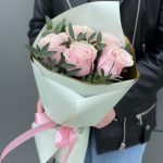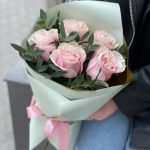 Роза пинк мондиаль – 5 шт. Эвкалипт – 1 шт. Писташ – 2 шт. Оформление – 1 шт.