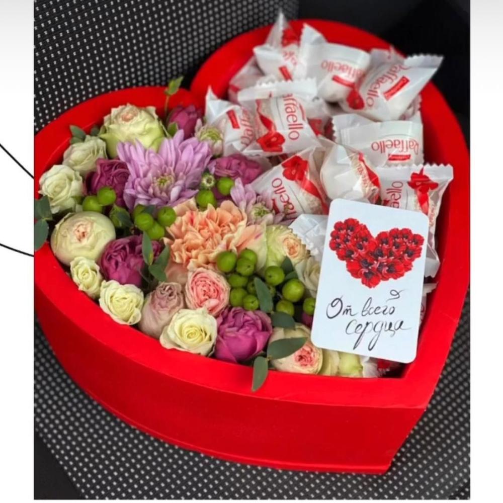 Коробка в виде сердца с миксом из роз и конфетами рафаэлло