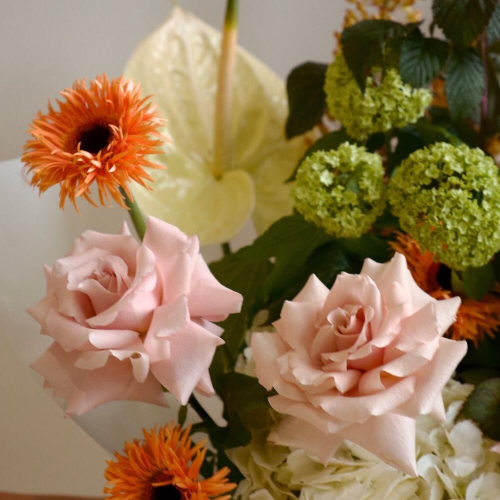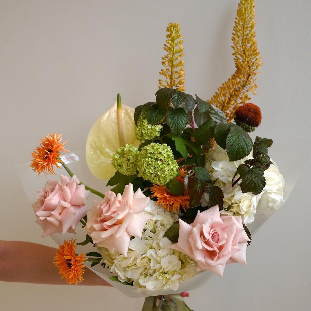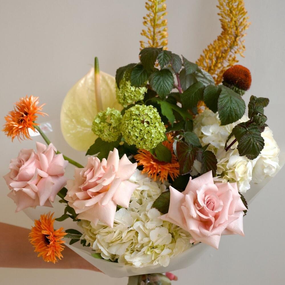 Альстромерии, Гортензии, Кустовые розы, Лизиантусы, Розы, Хризантемы
