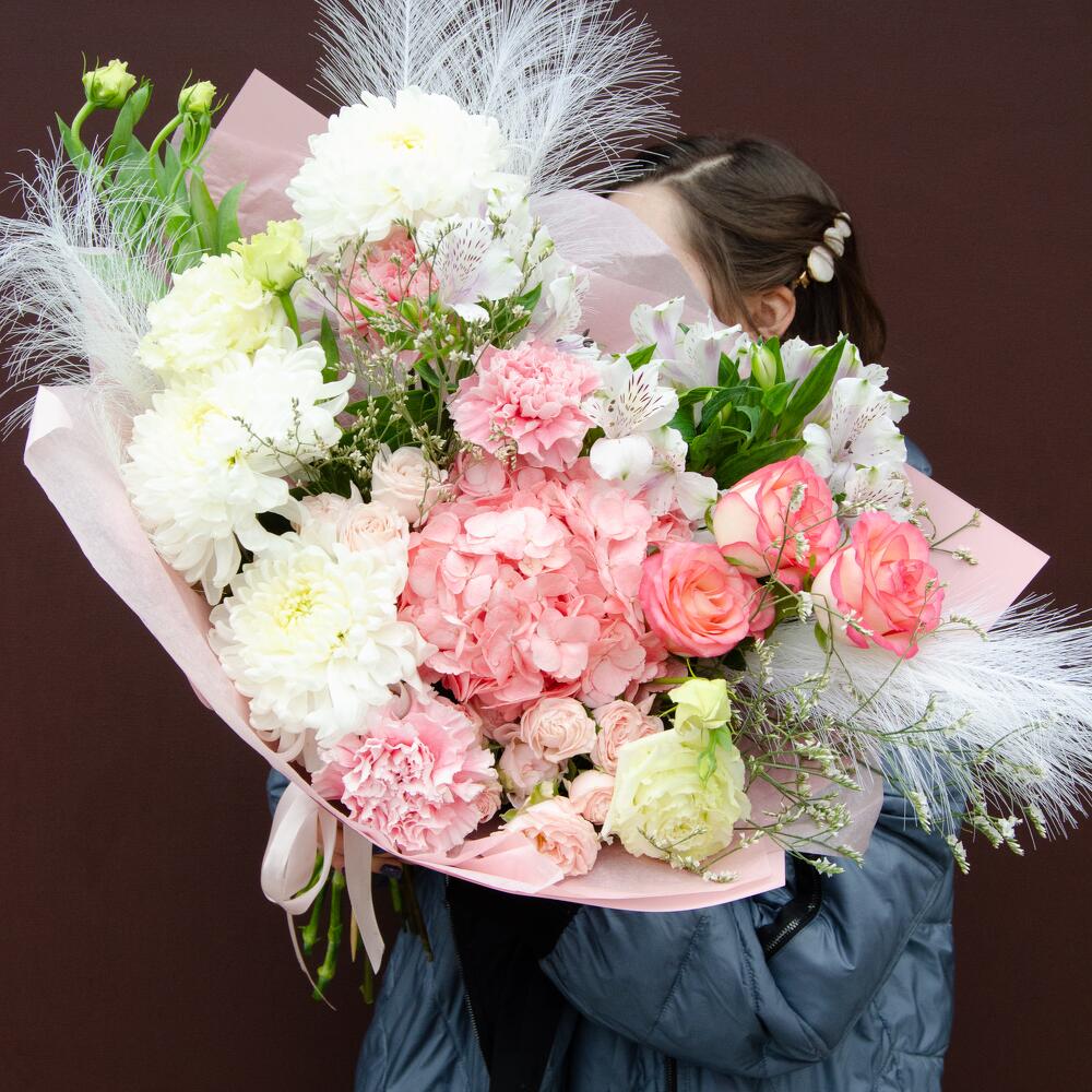Альстромерии, Гортензии, Кустовые розы, Лизиантусы, Розы, Хризантемы