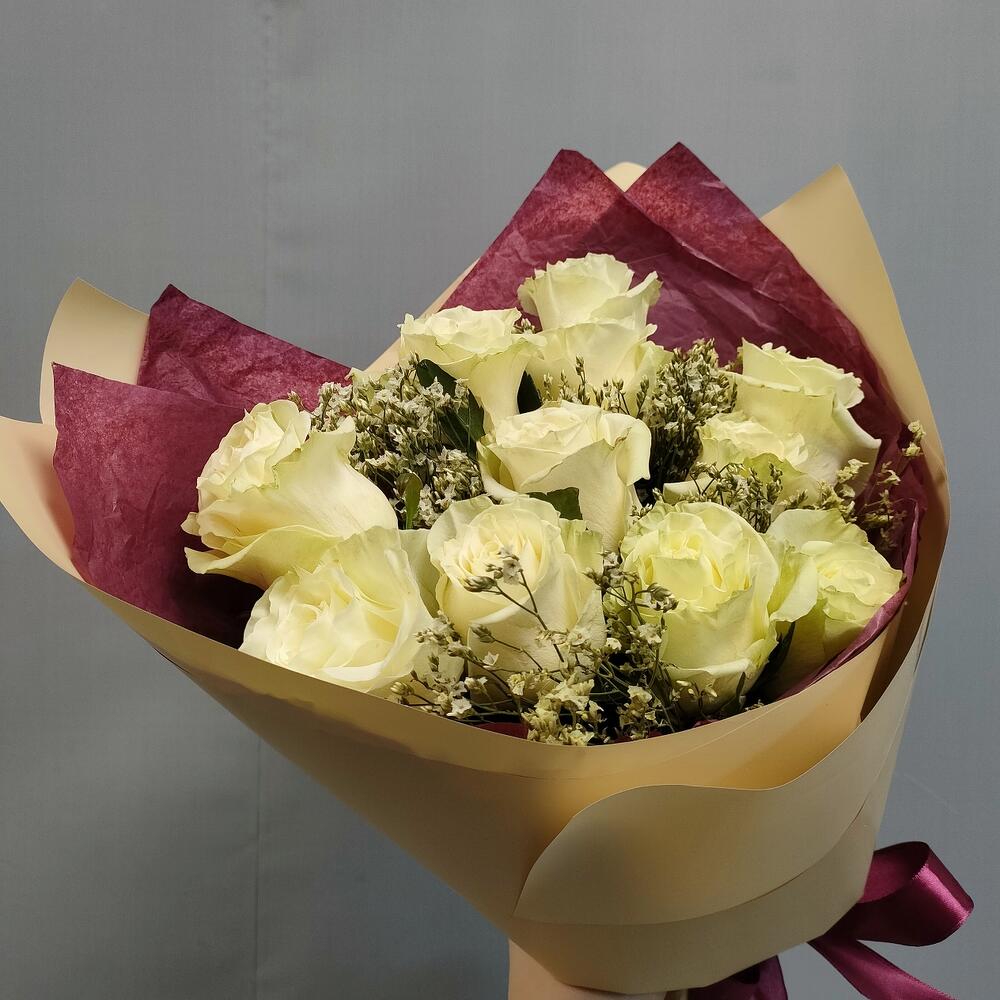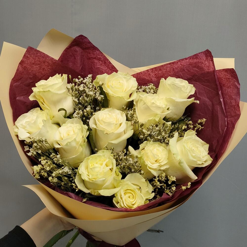 Роза Эквадор белая – 11 шт.Лимониум – 5 шт.Тишью – 2 шт.Пленка матовая – 1 шт.