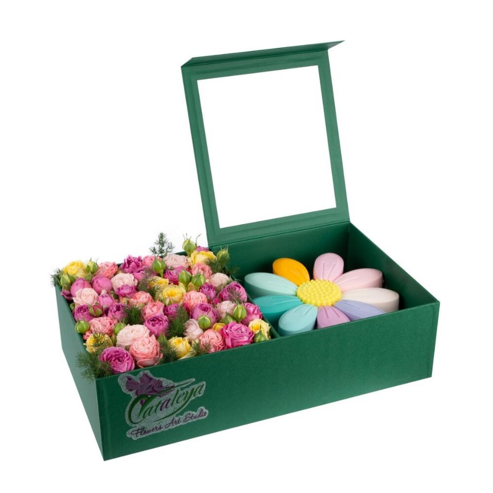 Композиция включает букет и торт.