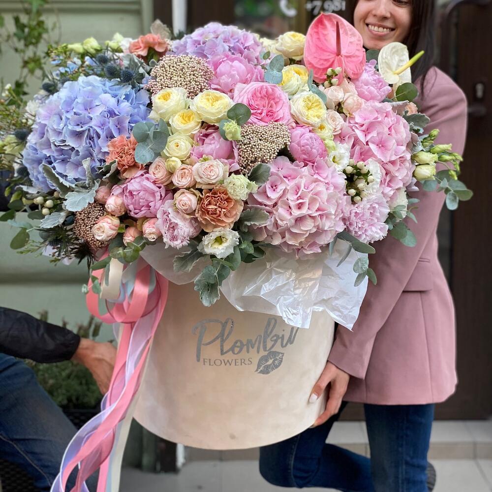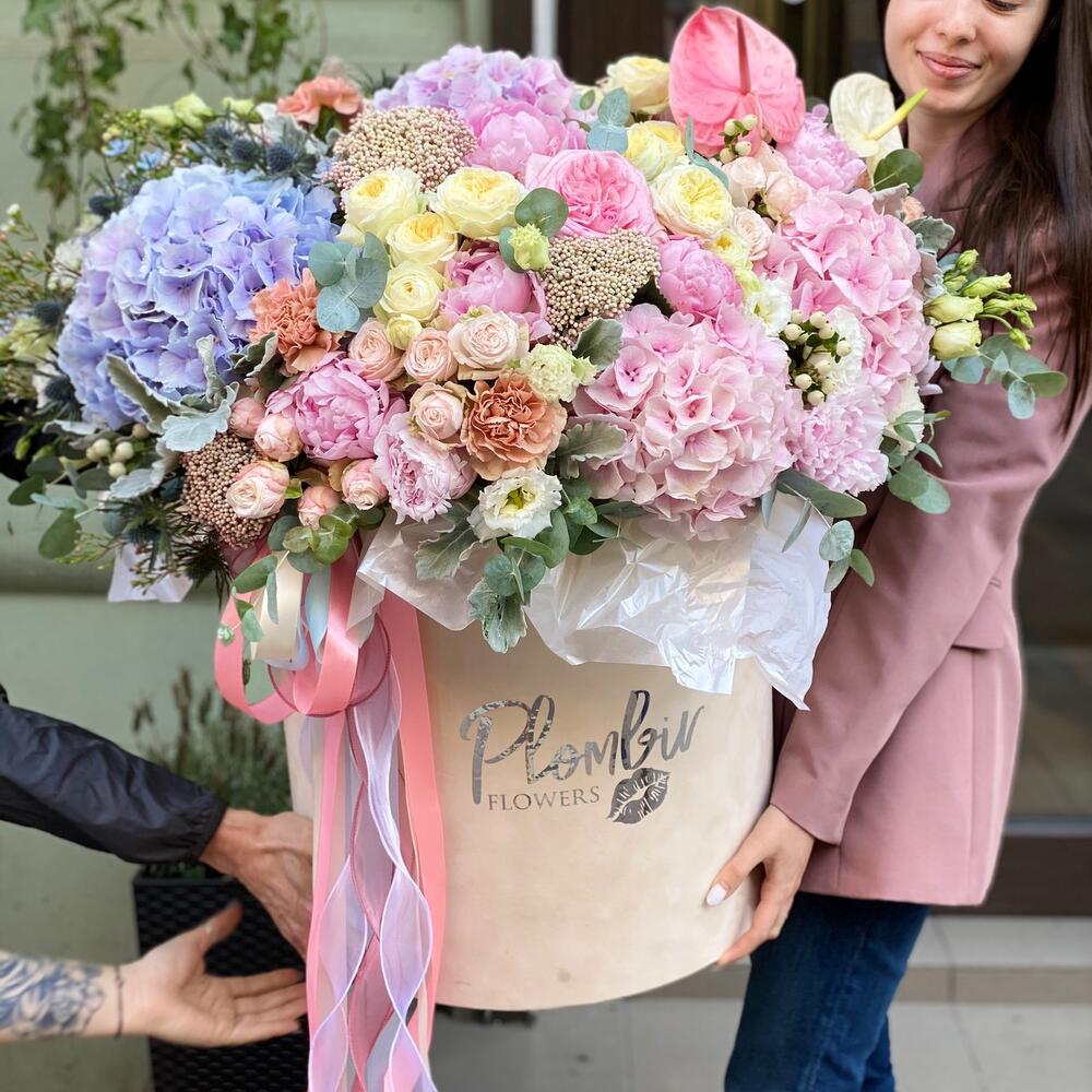 Коробка шляпная – 1 шт.Оазис флористический – 10 шт.Гортензия – 5 шт.Роза пионовидная – 10 шт.Кустовая роза – 10 шт.Пион – 5 шт.Хризантема кустовая – 5 шт.Диантус – 10 шт.Дельфиниум – 5 шт.Эустома – 10 шт.Зелень – 10 шт.сухоц – 5 шт.