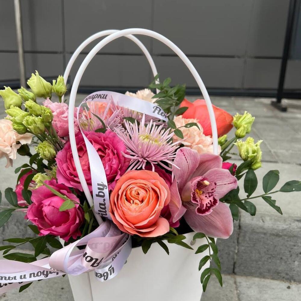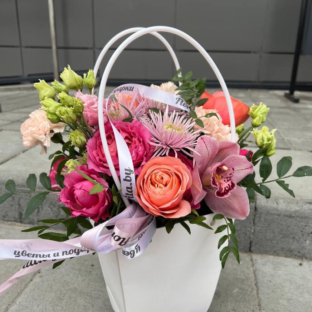 Альстромерии, Гвоздики, Кустовые розы, Лизиантусы, Розы, Хризантемы