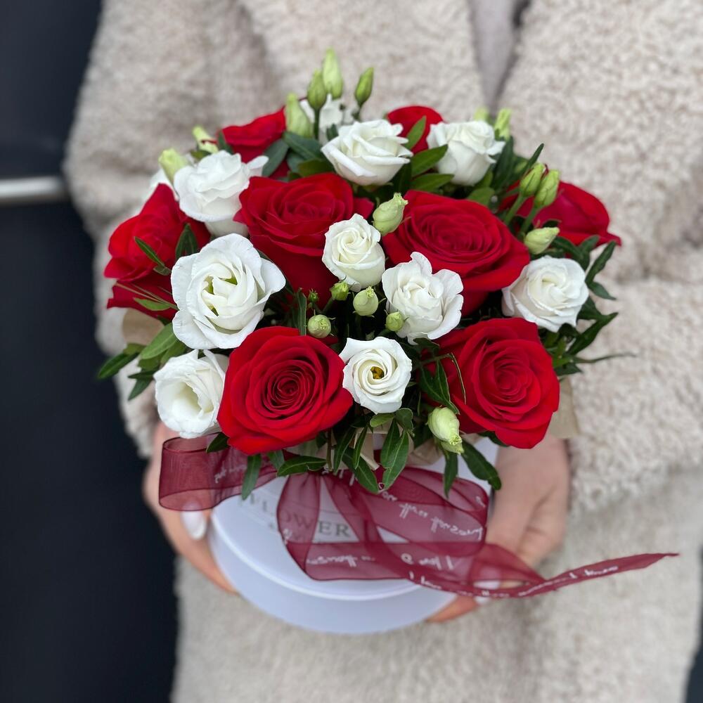 красная роза сорта фридом – 9 шт. эустома белая – 3 шт. Писташ – 2 шт. Оазис – 1 шт. Коробка – 1 шт.