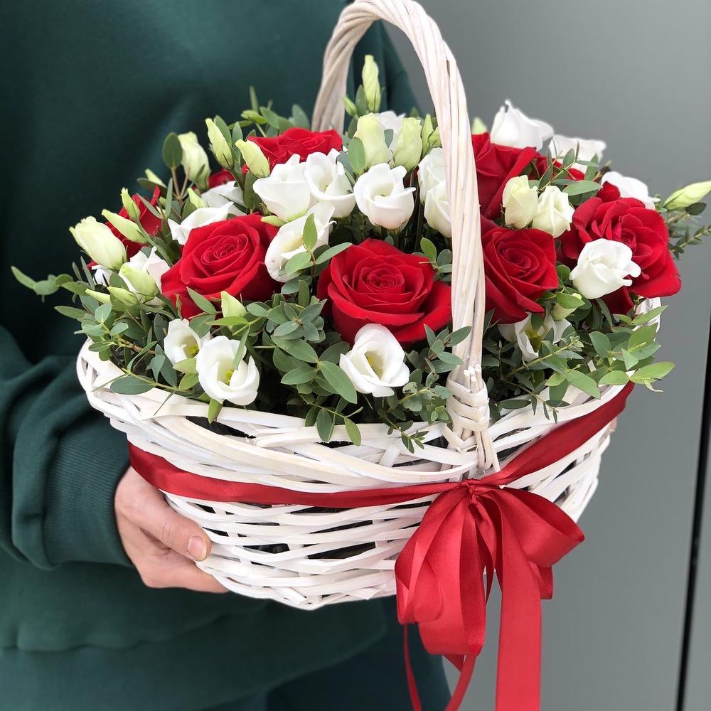 Корзина из красных роз и эустомы Вселенная