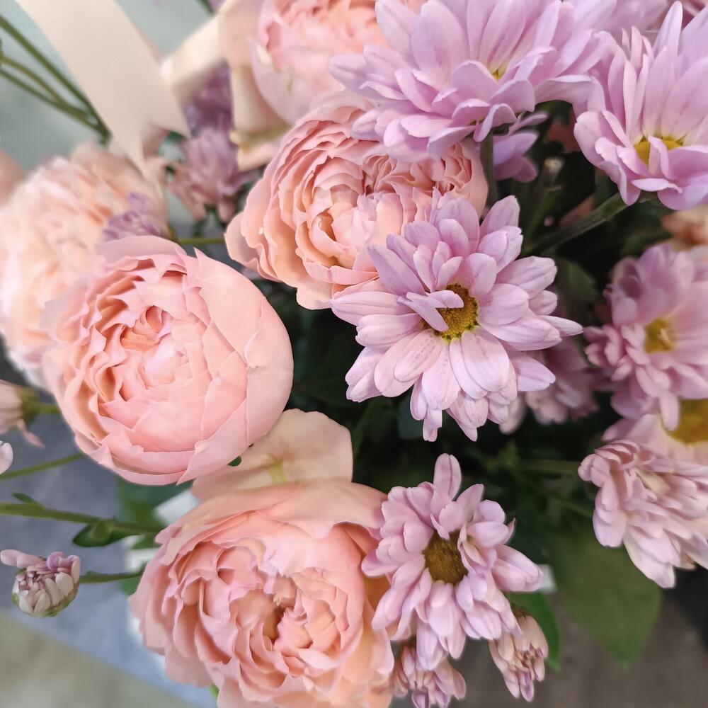 Гвоздики, Кустовые розы, Пионовидные розы, Розы