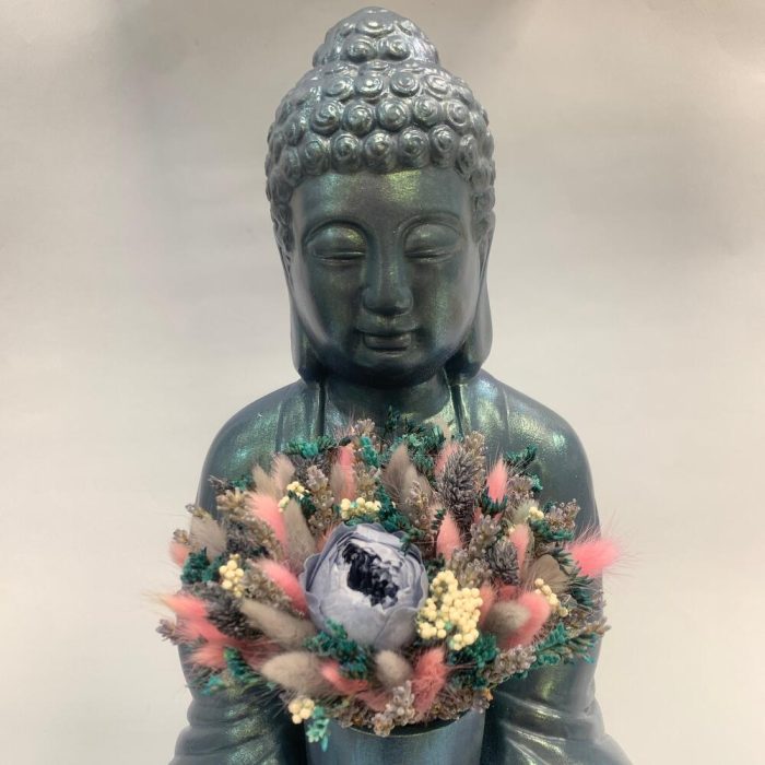 кашпо гипсовое будда – 1 шт.лагурус микс – 50 шт.Роза стабилизированная – 1 шт.Лаванда (сухоцвет) – 40 гр.Озотамнус – 1 шт.Лимониум – 1 шт.