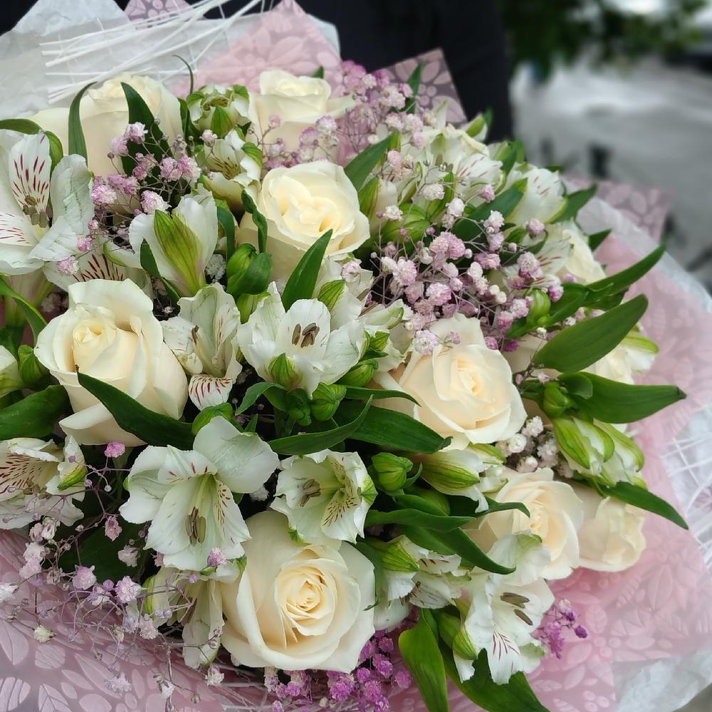 Роза – 13 шт.Альстромерия – 7 шт.Гипсофила – 3 шт.Зелень – 10 шт.Упаковка – 3 шт.