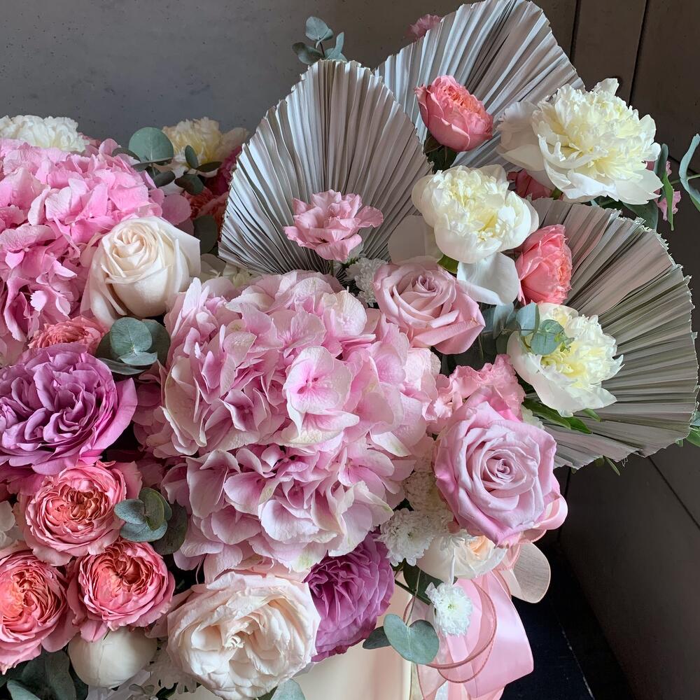Гортензия – 2 шт.пионы – 9 шт.эустома махровая – 7 шт.Роза кустовая джульетта – 7 шт.пальма сухоцвет – 3 шт.Сантини – 8 шт.white o’hara – 5 шт.фейт – 7 шт.Роза кустовая – 5 шт.Эвкалипт – 20 шт.Фисташка – 20 шт.кортадерия – 3 шт.