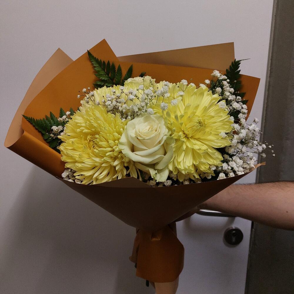 Хризантема одноголовая – 4 шт.Роза Мондиаль – 3 шт.Гипсофила – 2 шт.Листья папоротника – 3 шт.Упаковка дизайнерская – 2 шт.Лента атласная – 2 шт.