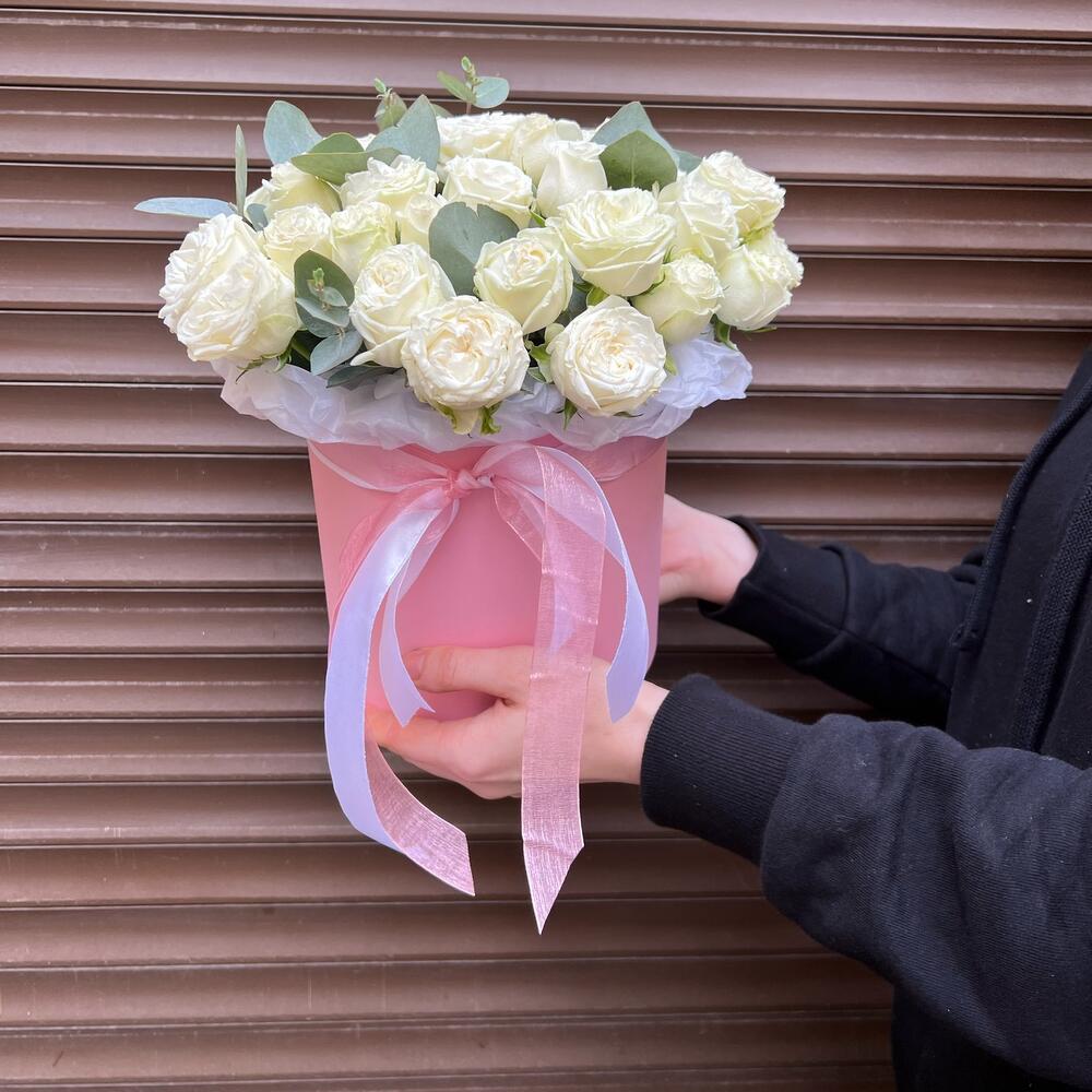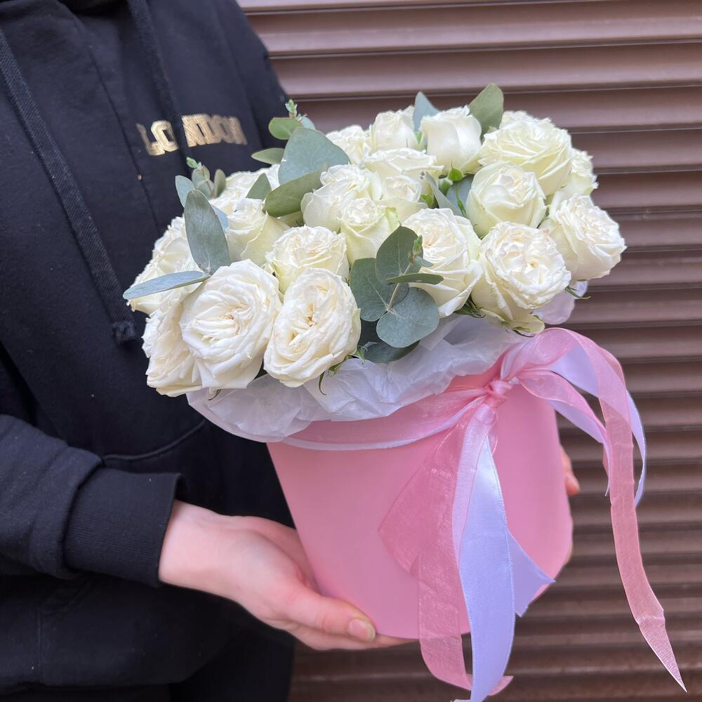 Эвкалипт – 10 шт.Лента атласная – 2 шт.Тишью – 1 шт.Коробка шляпная – 1 шт.Бомбастик – 11 шт.Оазис флористический – 1 шт.